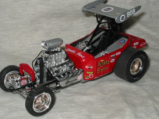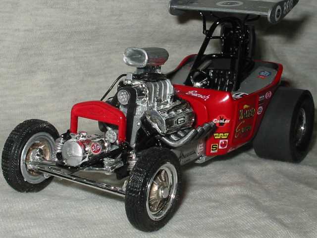 Click to see a bigger picture!This is the AMT reissued 1/25th scale Wild Willie Borsch T Altered, model features some engine wiring, also the kit rear axle was replaced by a better detailed Revell Funny car rear end, otherwise straight from the box.